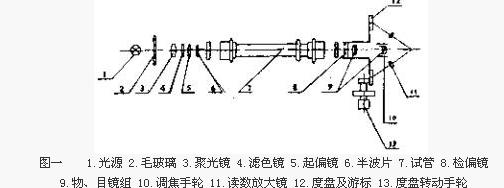 為便于操作,旋光儀的光學(xué)系統(tǒng)以傾斜20°安裝在基座上。光源采用20瓦鈉光燈(波長(zhǎng)λ=5893A°)。鈉光燈的限流器安裝在基座底部,毋需外接限流器。旋光儀的偏振器均為聚乙烯醇人造偏振片。三分視界是采用勞倫特石英板裝置(半波片)。轉(zhuǎn)動(dòng)起偏鏡可調(diào)整三分視場(chǎng)的影蔭角(旋光儀出廠時(shí)調(diào)整在3°左右)。旋光儀采用雙游標(biāo)讀數(shù),以消除度盤偏心差。度盤分360格,每格1°,游標(biāo)分20格,等于度盤19格,用游標(biāo)直接讀數(shù)到0.05°(如圖四)。度盤和檢偏鏡固為一體,借手輪(1)能作粗、細(xì)轉(zhuǎn)動(dòng)。游標(biāo)窗前方裝有兩塊4倍的放大鏡,供讀數(shù)時(shí)用。測(cè)得溶液的旋光度后,就可以求出物質(zhì)的比旋度。根據(jù)比旋度的大小,就能確定該物質(zhì)的純度和含量了。