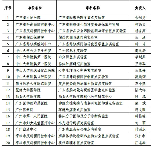 同時(shí)入選20個(gè)重點(diǎn)醫(yī)學(xué)實(shí)驗(yàn)室的包括中山大學(xué)系統(tǒng)5個(gè),廣東省疾控中心2個(gè),深圳市疾控中心2個(gè)等。