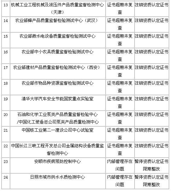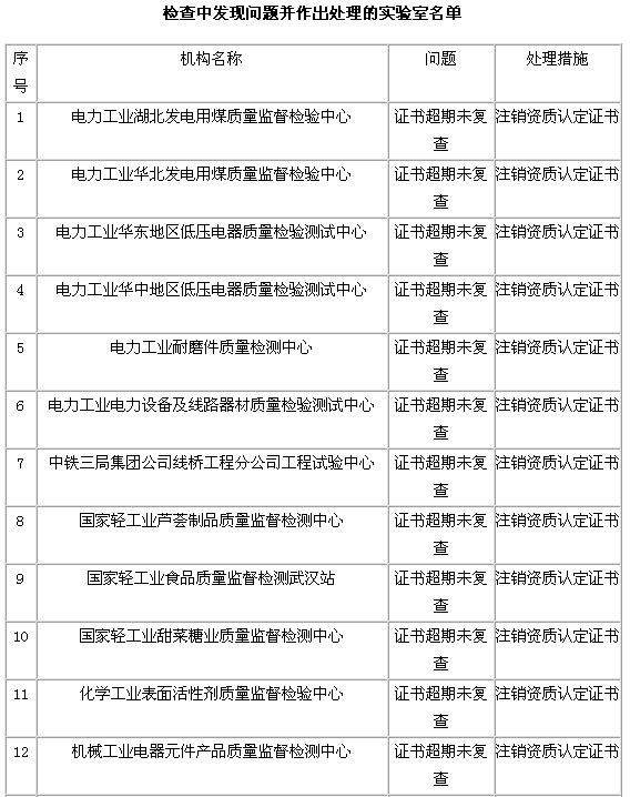 1.此次檢查發(fā)現(xiàn)了個(gè)別實(shí)驗(yàn)室的質(zhì)量管理體系存在較大問(wèn)題,部分實(shí)驗(yàn)室證書(shū)到期未申請(qǐng)復(fù)查(名單見(jiàn)附件),將分別采取限期整改或者注銷資質(zhì)認(rèn)定證書(shū)的處理措施。