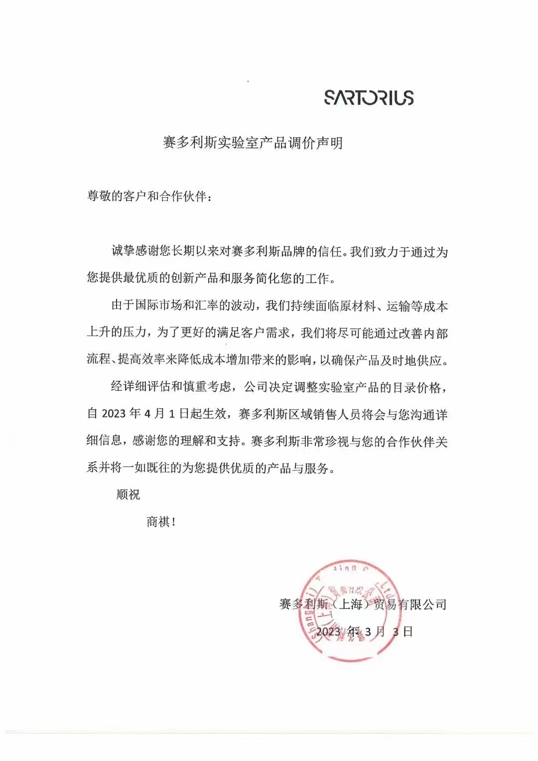 誠摯感謝您長期以來對賽多利斯品牌的信任。我們致力于通過為您提供最優(yōu)質(zhì)的創(chuàng)新產(chǎn)品和服務(wù)簡化您的工作。由于國際市場和匯率的波動(dòng),我們持續(xù)面臨原材料、運(yùn)輸?shù)瘸杀旧仙膲毫,為了更好的滿足客戶需求,我們將盡可能通過改善內(nèi)部流程、提高效率來降低成本增加帶來的影響,以確保產(chǎn)品及時(shí)地供應(yīng)經(jīng)詳細(xì)評估和慎重考慮,公司決定調(diào)整實(shí)驗(yàn)室產(chǎn)品的目錄價(jià)格自2023年4月1日起生效,賽多利斯區(qū)域銷售人員將會(huì)與您溝通詳細(xì)信息,感謝您的理解和支持。賽多利斯非常珍視與您的合作伙伴關(guān)系并將一如既往的為您提供優(yōu)質(zhì)的產(chǎn)品與服務(wù)。順祝商祺!