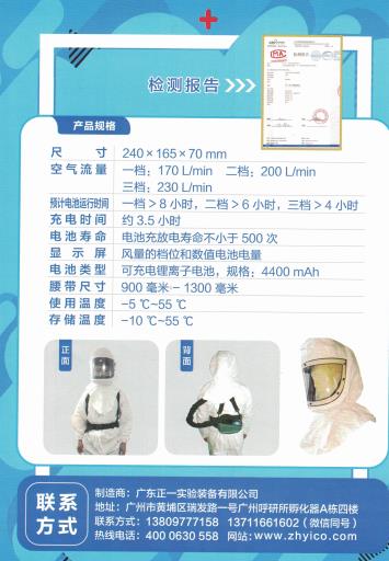 廣東正一生產(chǎn)的該產(chǎn)品(ZH2002)是一款正壓式電動送風(fēng)呼吸器。產(chǎn)品主機包含頭罩、送風(fēng)機
